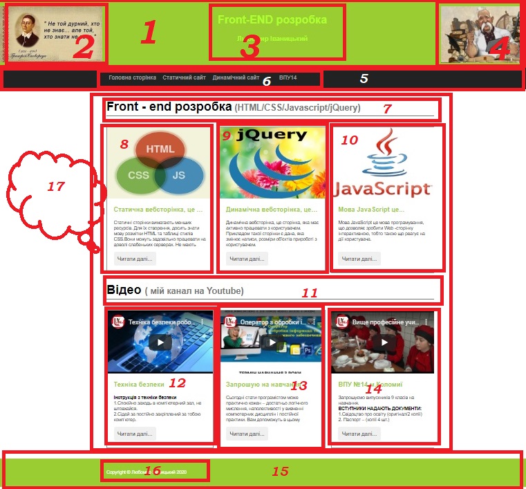 В блоці 1, як в контейнері розміщено 2,3 і 4 блок з контентом. А в блоці 17 містяться боки: 7,8,9,10,11,12,13,14.