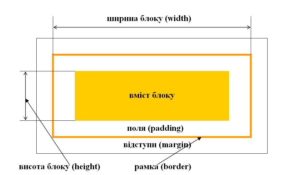 Для цього використовуються властивості: padding-top, padding-right, padding-bottom, padding-left 3.Ширина (width) - Ширина блоку 4.Висота (height) - Висота блоку